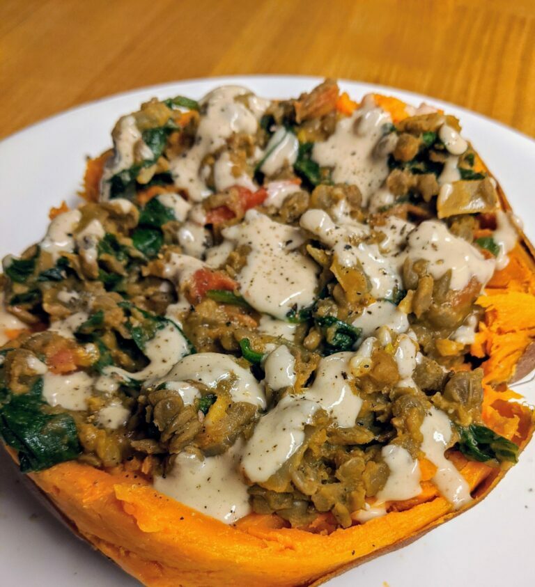 This hearty vegan dish will satisfy any meat-eater! The spices in the lentils give it warmth, while the lemony tahini dressing gives it a bright zestiness. There’s a lot of flavor in each bite, and it’s so good. And if you have any leftover lentils and dressing, throw some on a bed of steamed spinach. Enjoy!