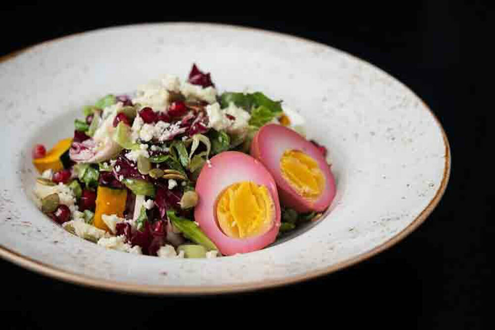 Chef Dima Martseniuk, Veselka: Veggie Reuben Latke / Smoked Ham Reuben Latke, homemade sauerkraut, homemade Russian dressing, Swiss cheese