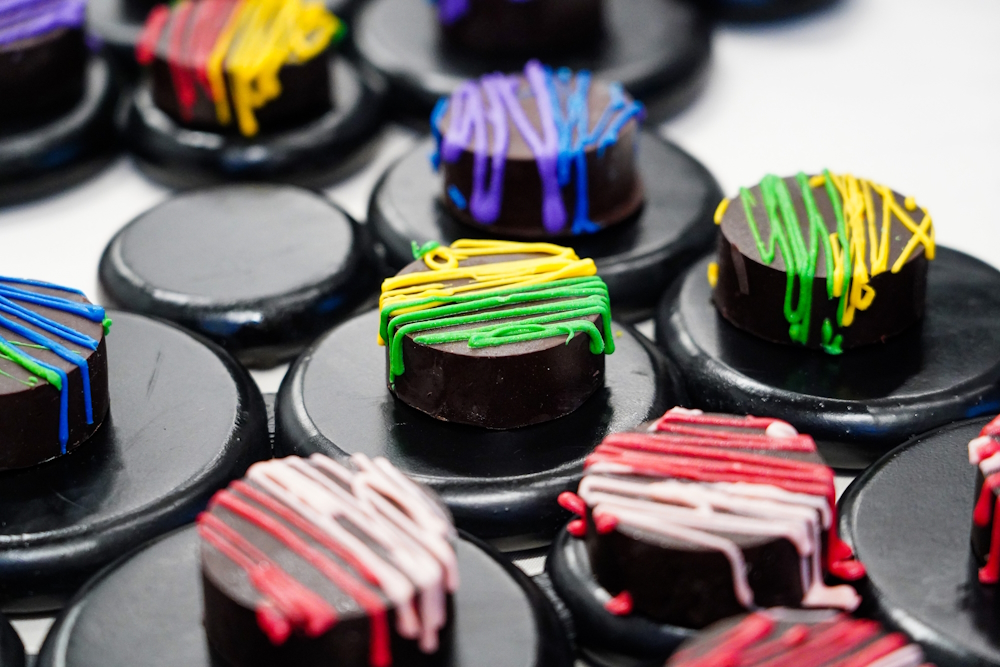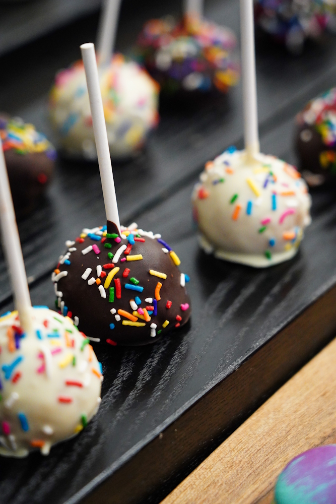 We tapped into a local source for dessert, serving rainbow-sprinkled cake pops, chocolate-covered Oreos with vibrant drizzles, and multi-hued macarons from Buttermilk Bakeshop. The colorful theme was a nod to the dynamic graffiti and murals covering the venue’s historic brick walls.