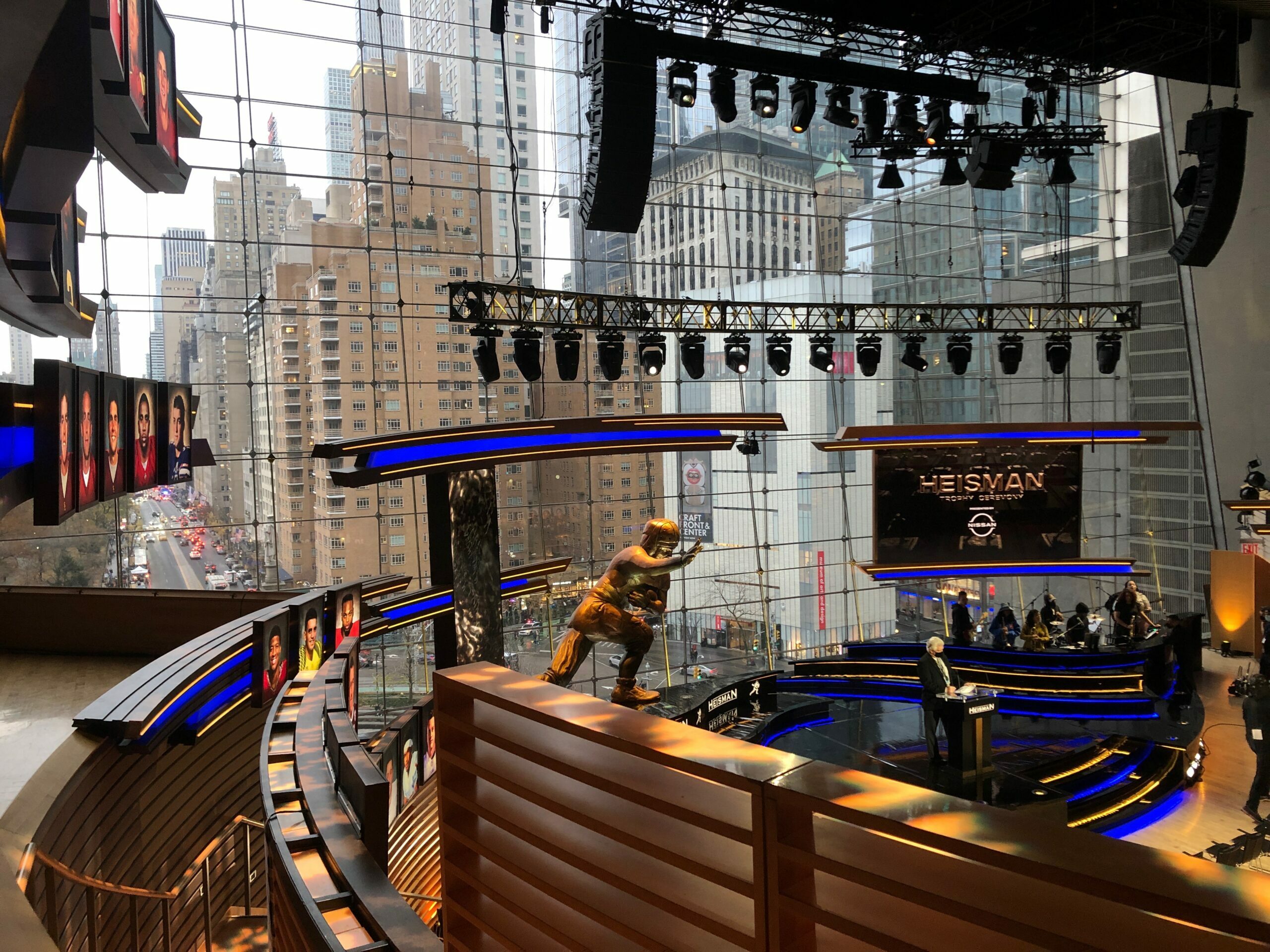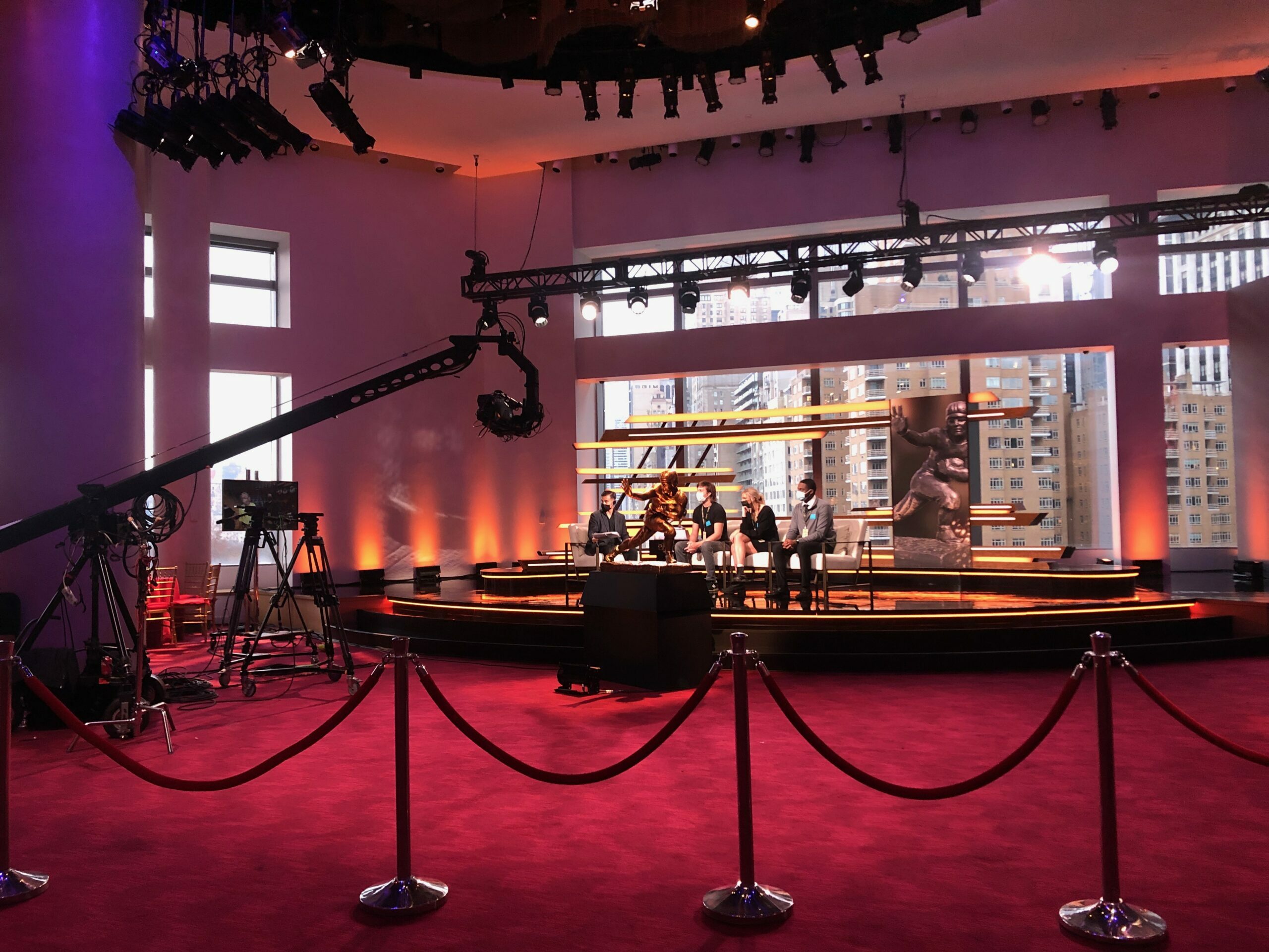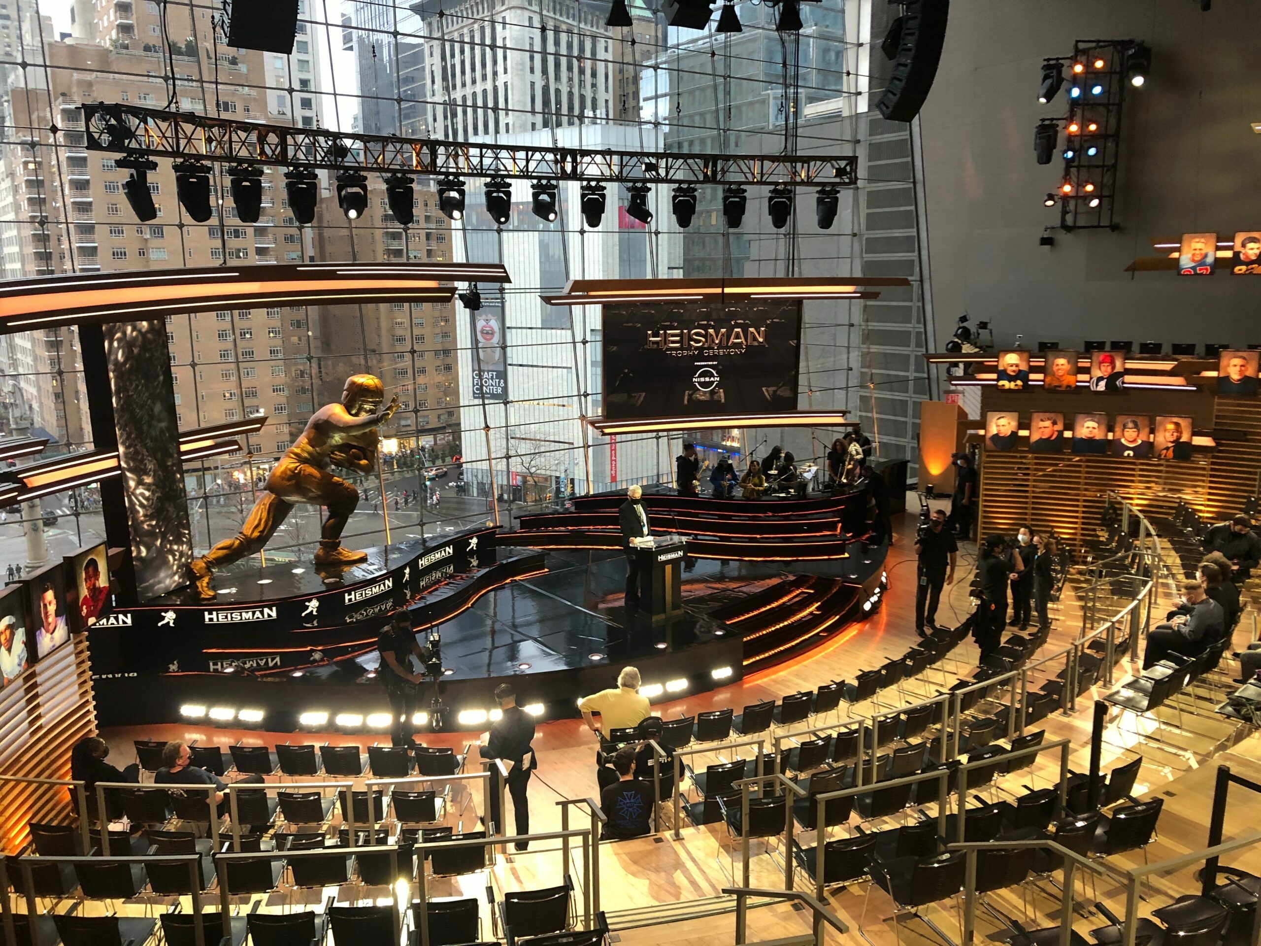 After touring dozens of venues across New York City, the Heisman Trust and ESPN leaders selected the stunning Appel Room for the Heisman Trophy Ceremony held Saturday, December 11, 2021. Production design was done by award-winning creative director David Korins with lighting design by David Grill and a 9-foot tall hand-carved and painted replica Heisman trophy by Rebecca Ward of Mystic Scenic Studios.