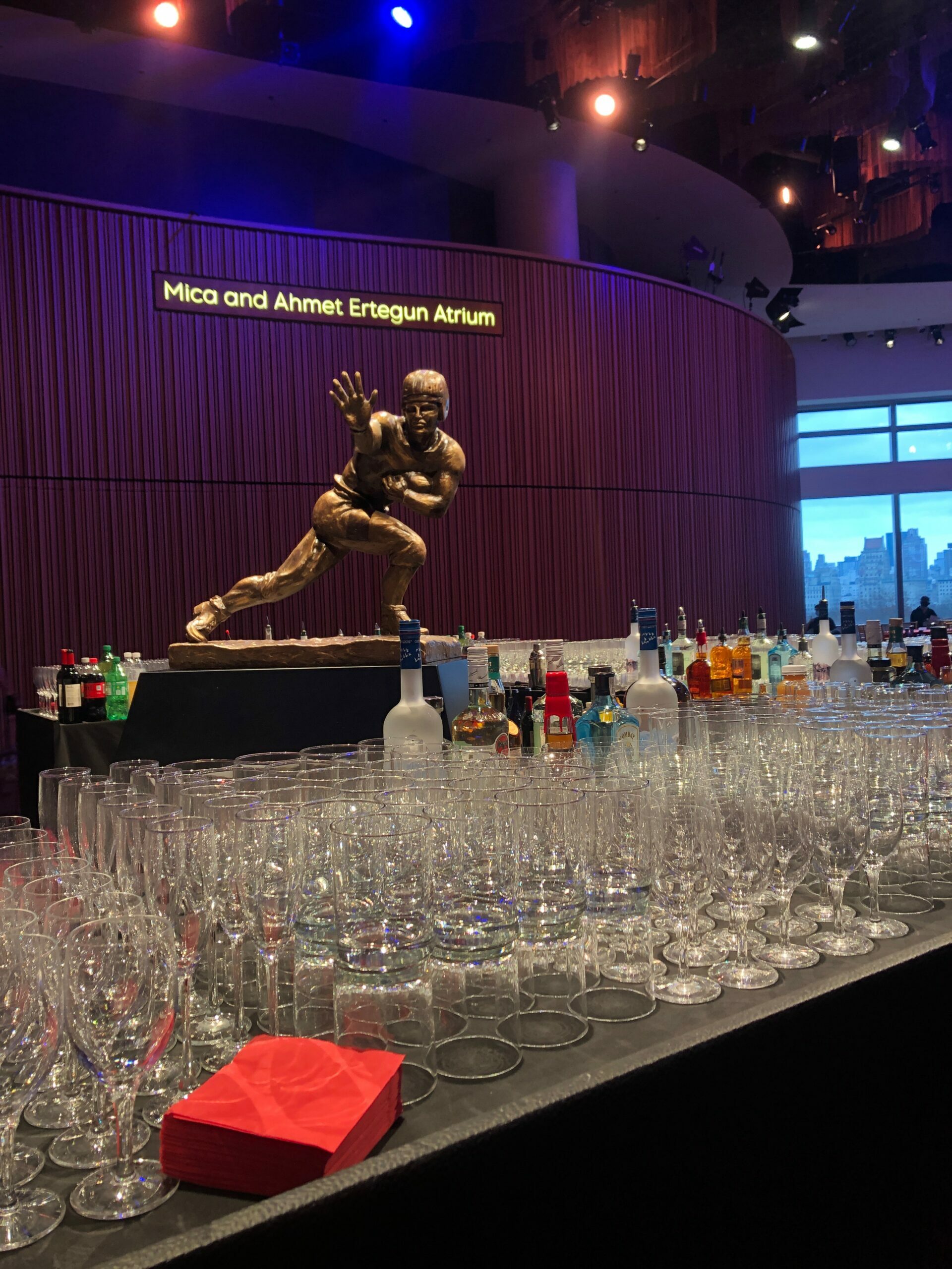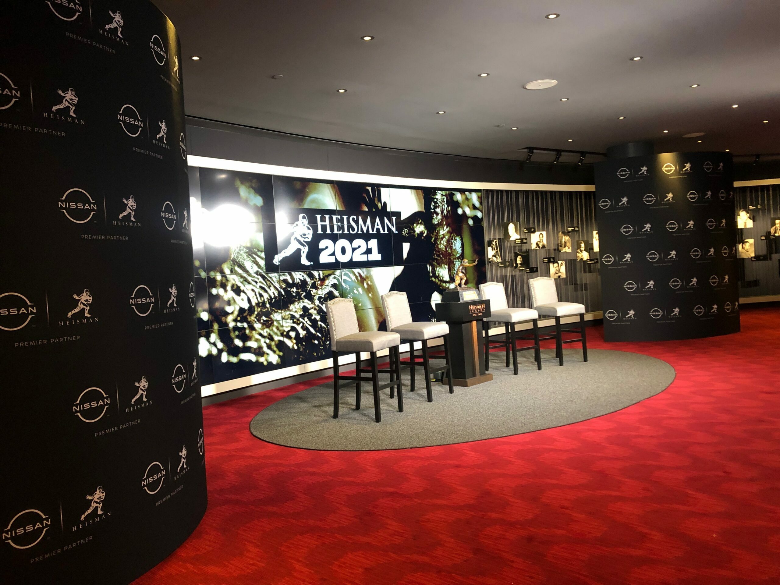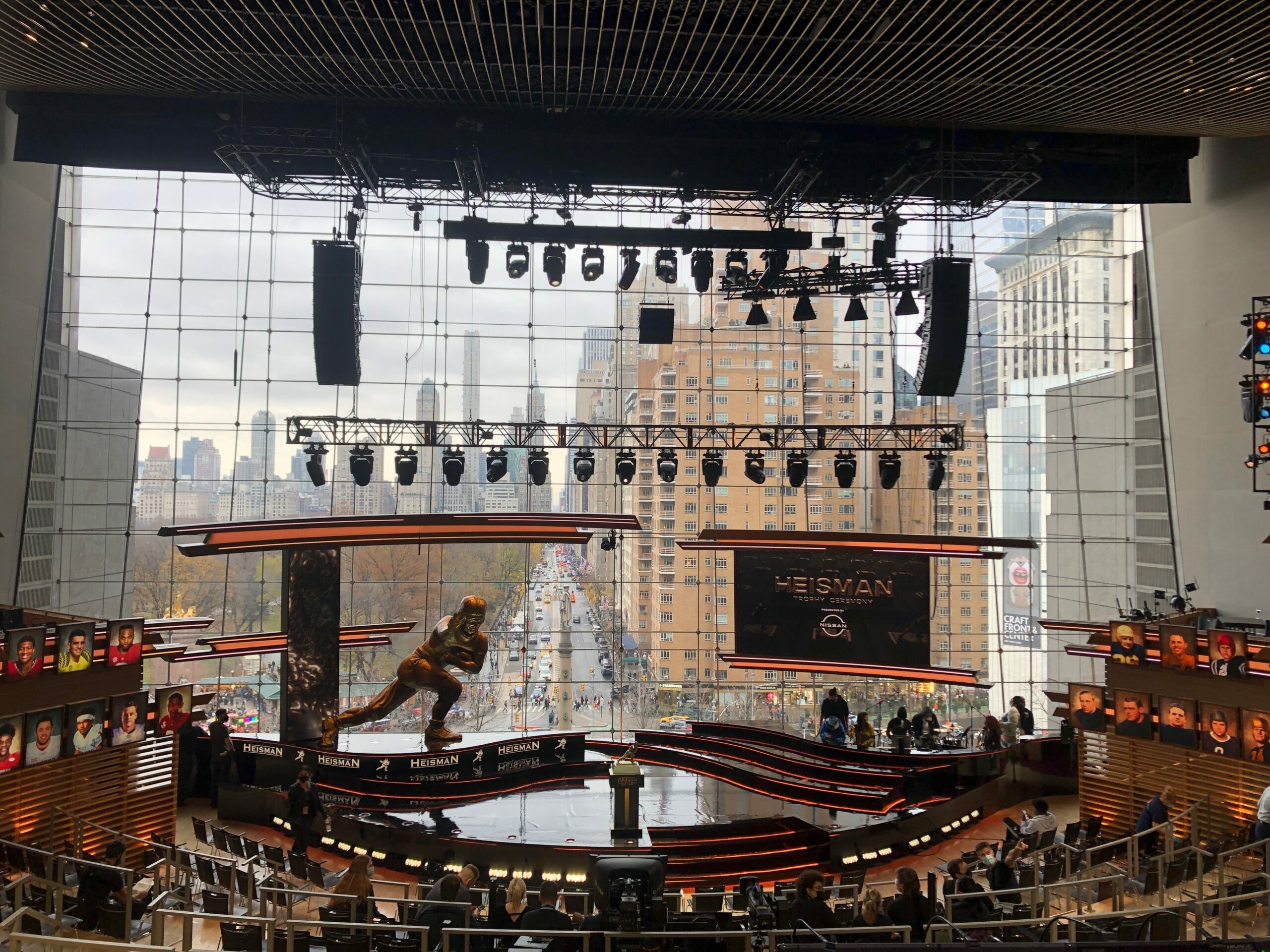 After touring dozens of venues across New York City, the Heisman Trust and ESPN leaders selected the stunning Appel Room for the Heisman Trophy Ceremony held Saturday, December 11, 2021. Production design was done by award-winning creative director David Korins with lighting design by David Grill and a 9-foot tall hand-carved and painted replica Heisman trophy by Rebecca Ward of Mystic Scenic Studios.